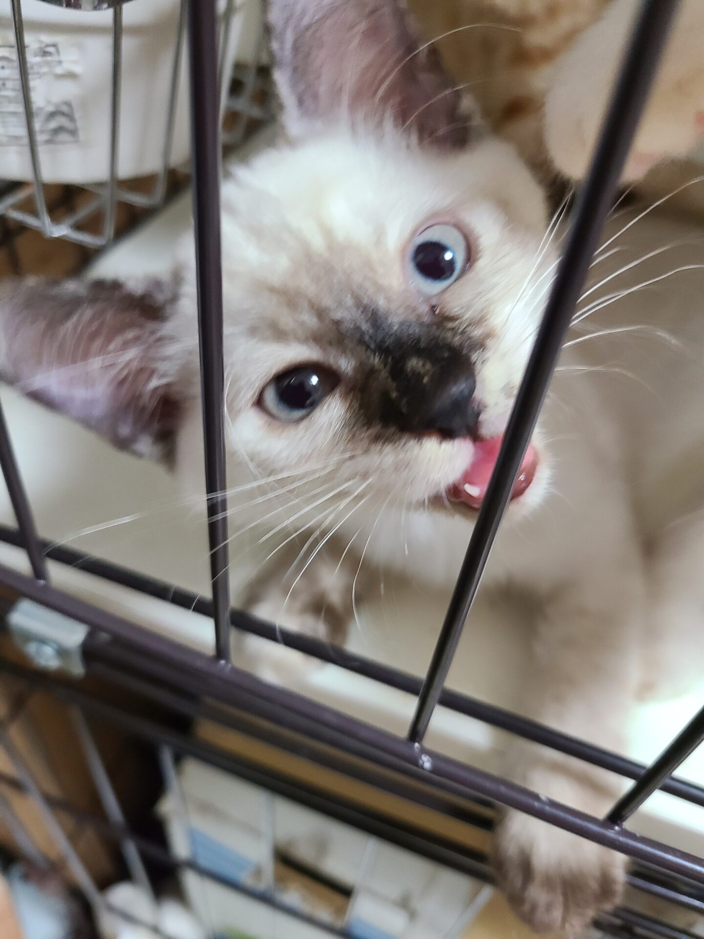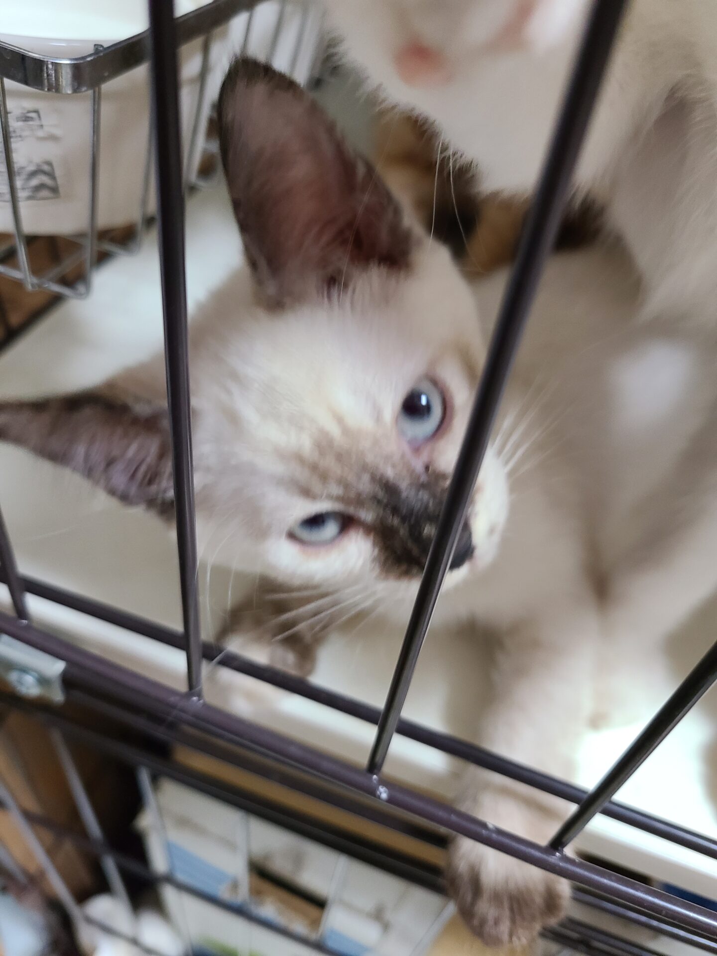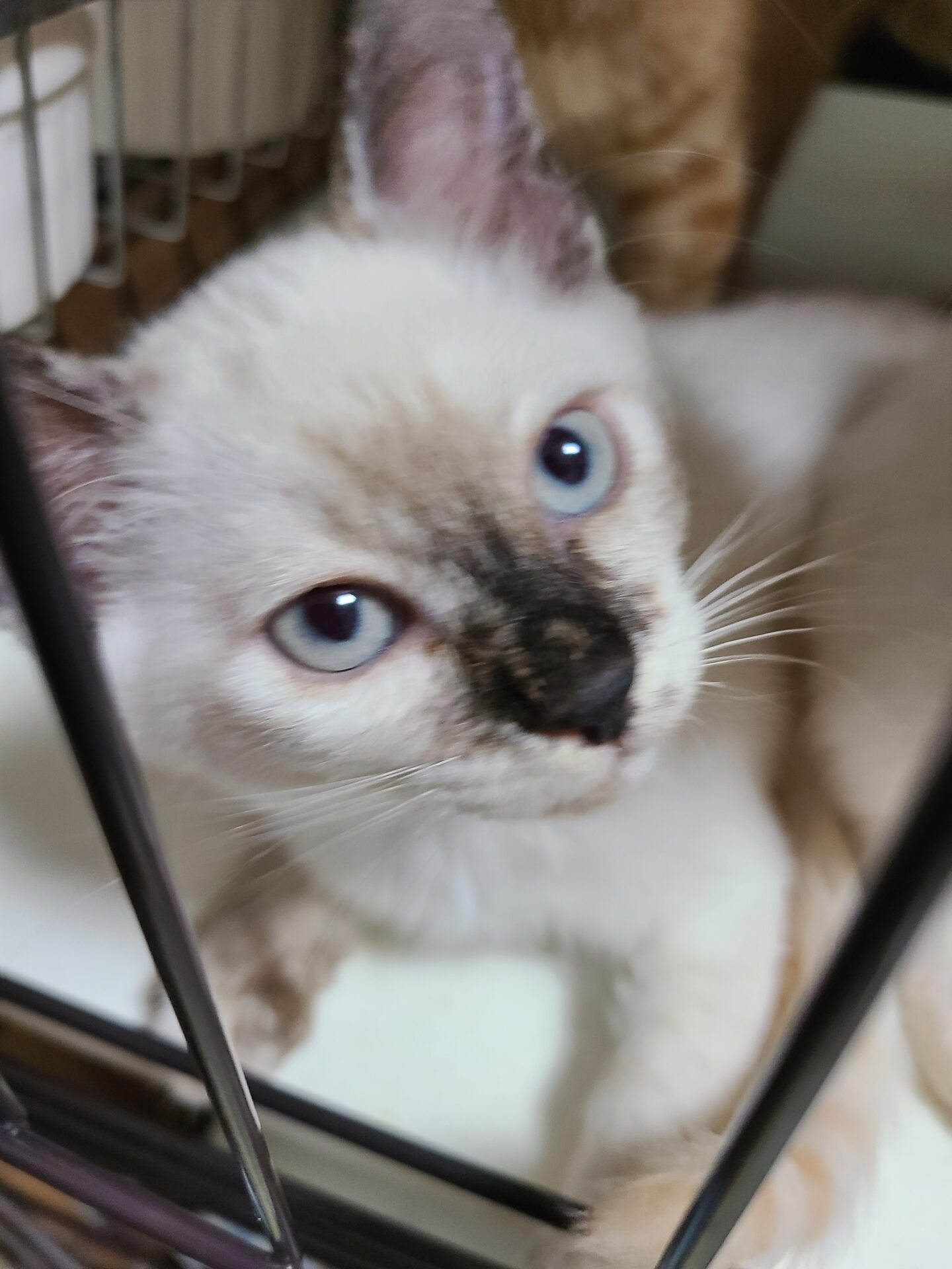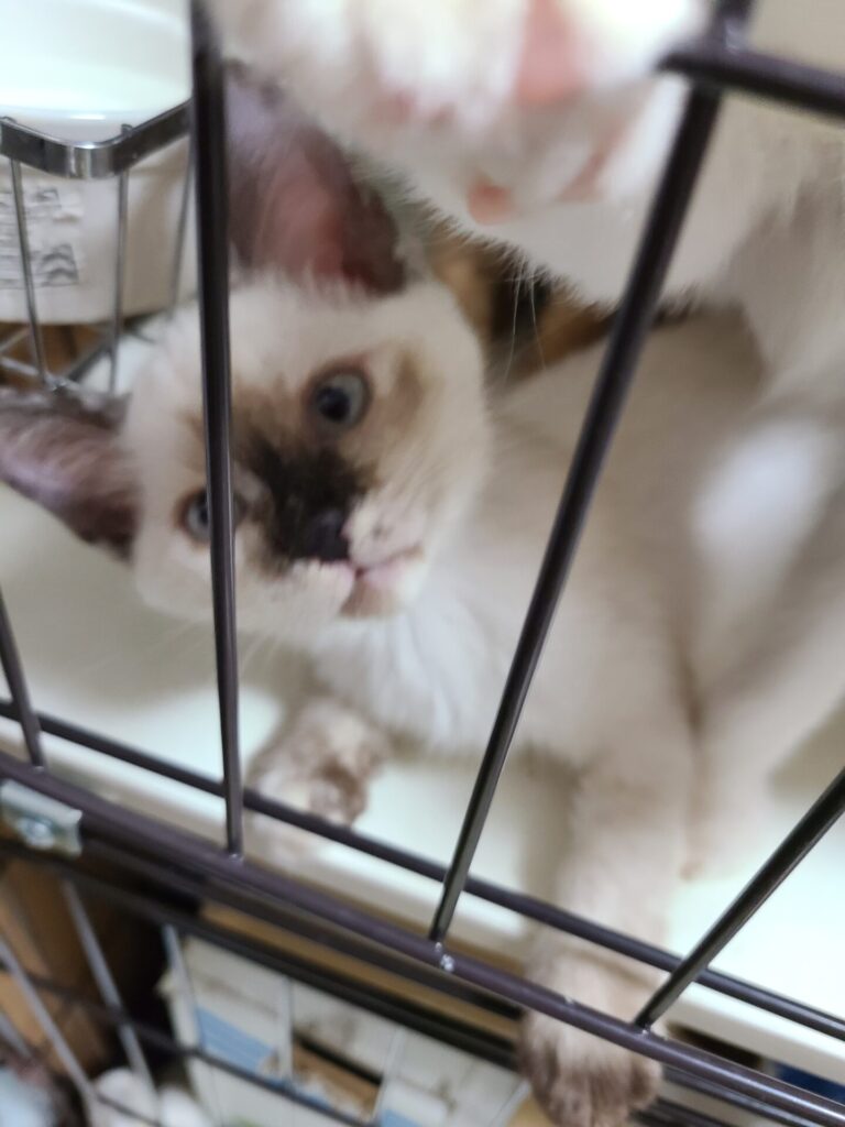 シャム系でお顔の真ん中あたりがこげ茶、手足にもシールポイントがあります。