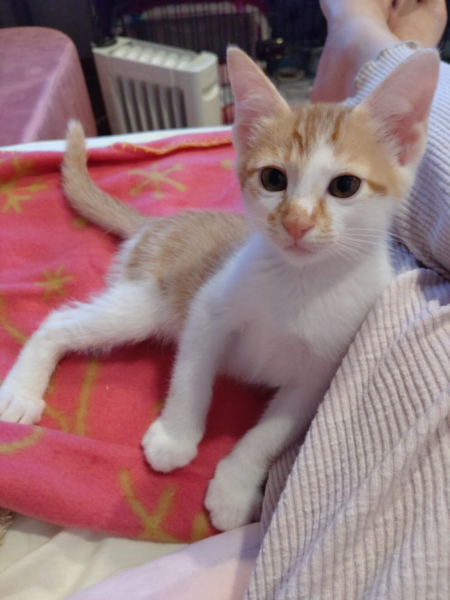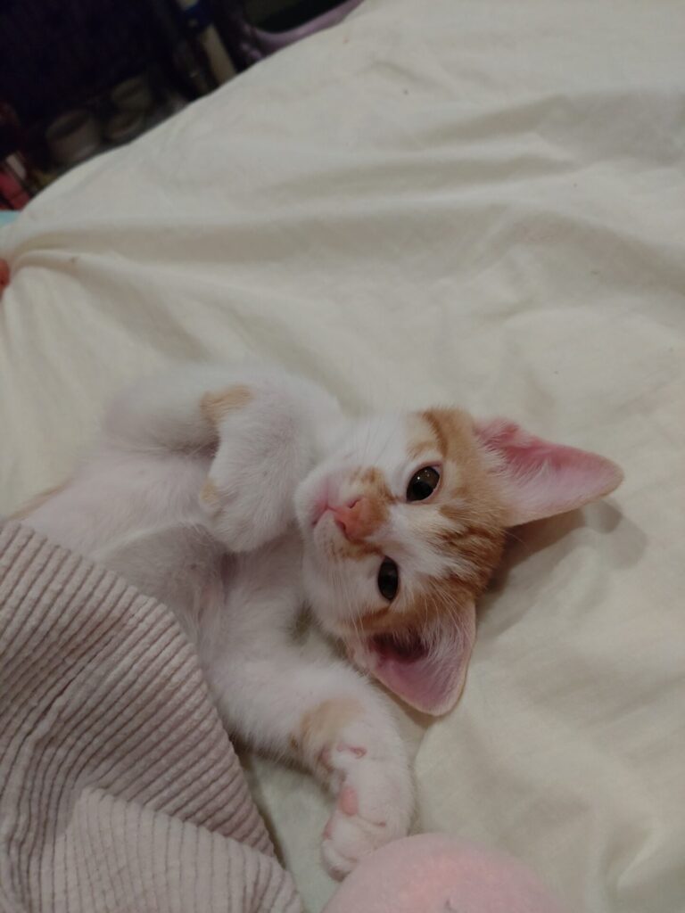 お膝やナデナデが大好きな甘えん坊で、遊び疲れて眠たくなるとゴロゴロしながらお膝目掛けてやって来ます。子猫ならではのヤンチャさと多少のおっとり具合がメッチャ可愛い子です。