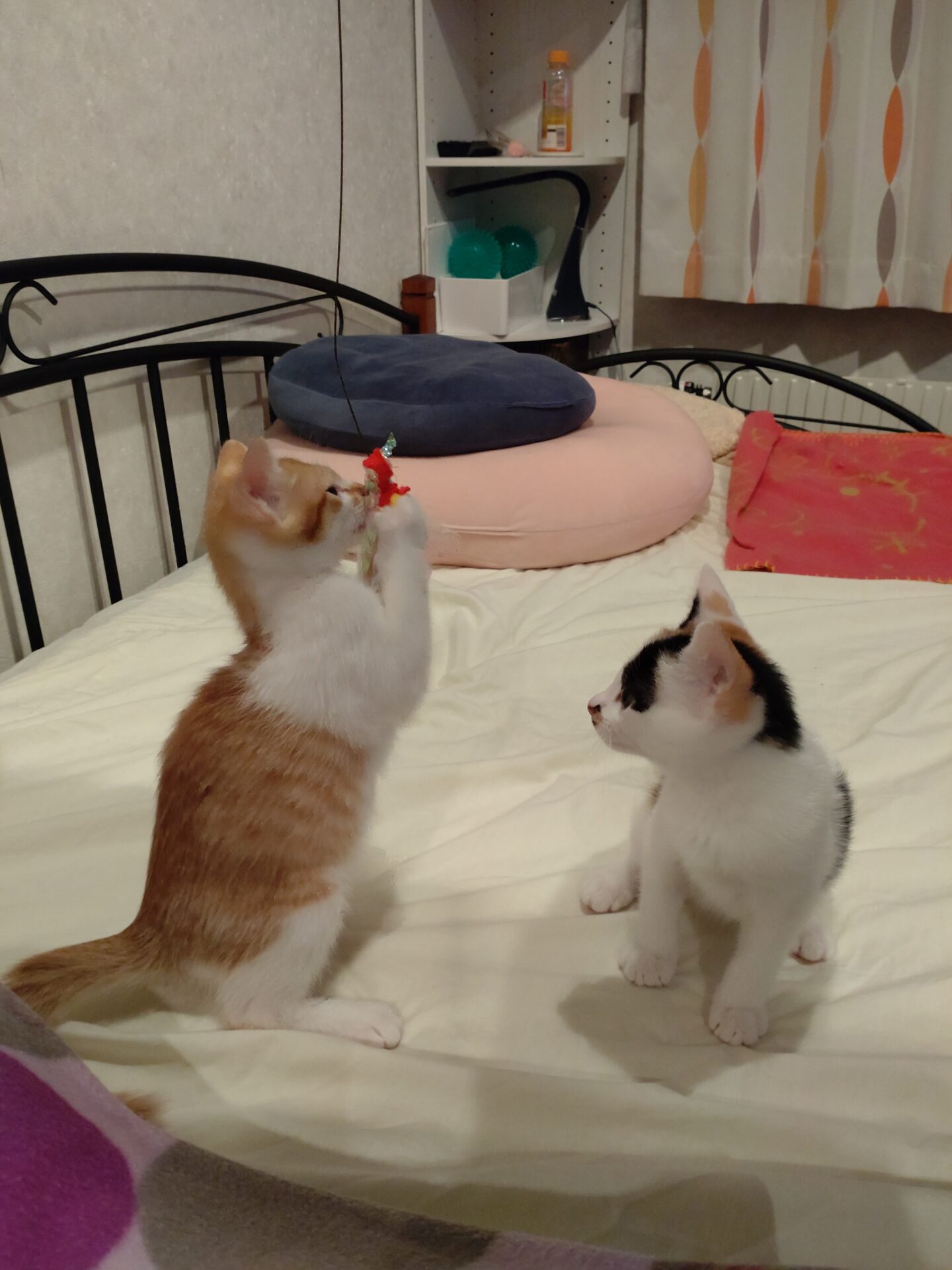 子猫らしく元気に遊びますが兄妹達に比べて少し遠慮がちな時があります。お膝の上に乗りに来るのも、オモチャで遊ぶのも最後になっちゃうおっとり君です。