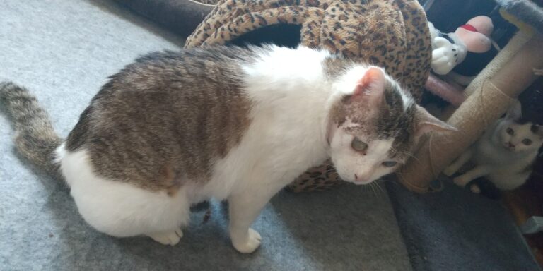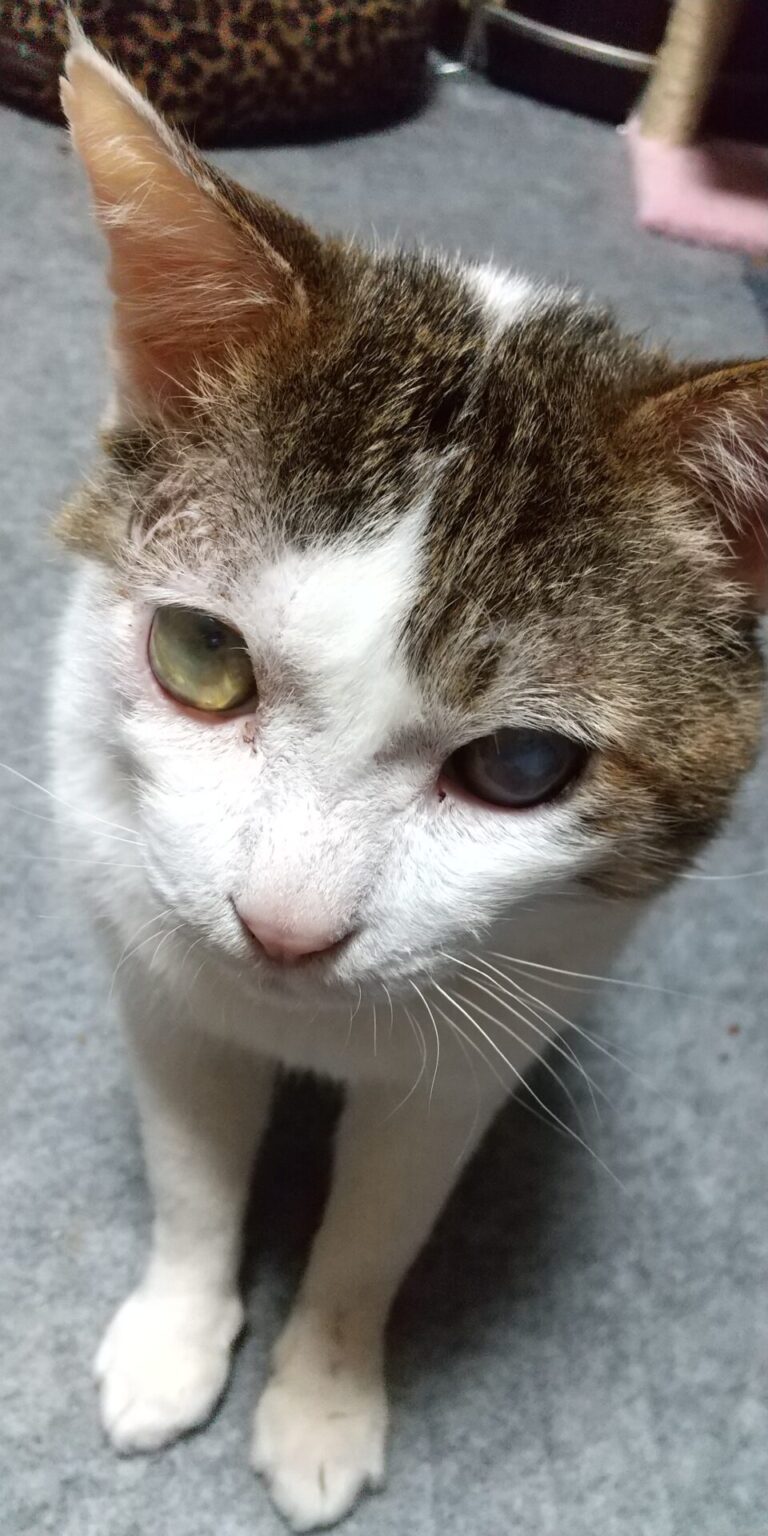 保護された時には眼圧が上がって飛び出していました。すぐに眼科医にて検査。右目水晶体はない。左目はあるが弱視であろう。との診断でした。身体中にもハゲた古い傷がたくさんありました。