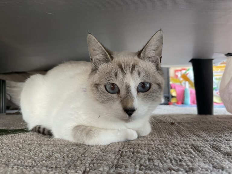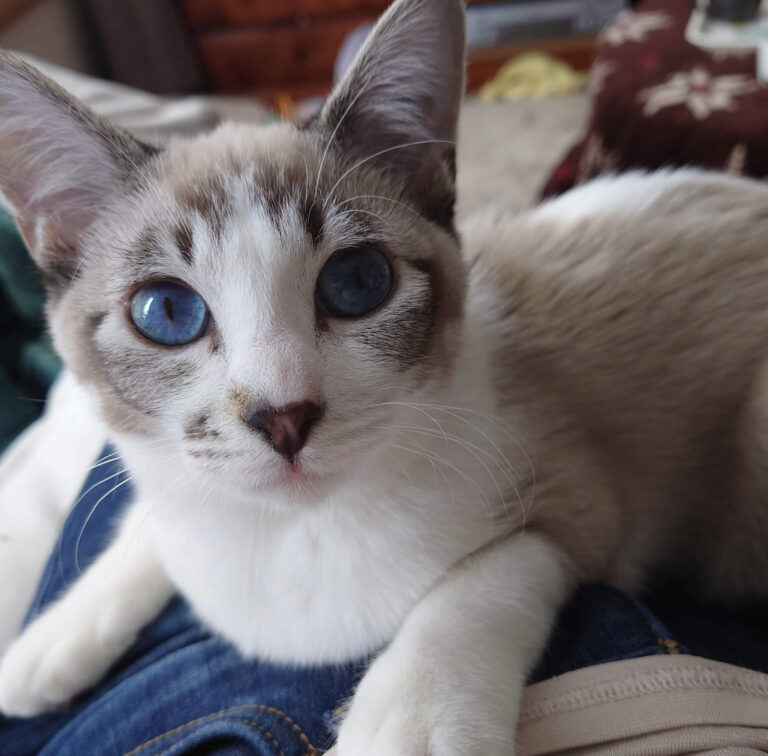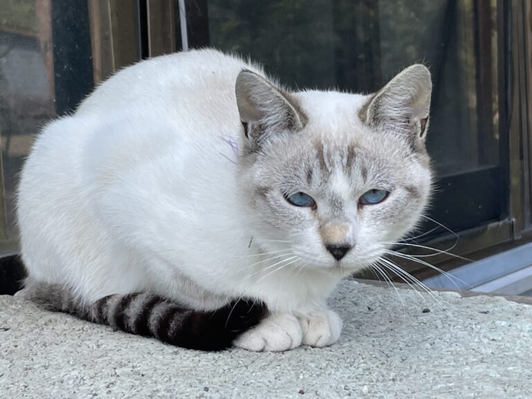 青い目で体は白く、しっぽはトラ柄という美しい容姿。