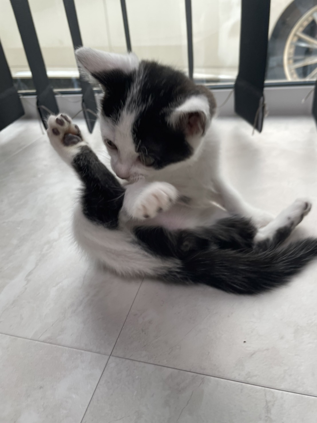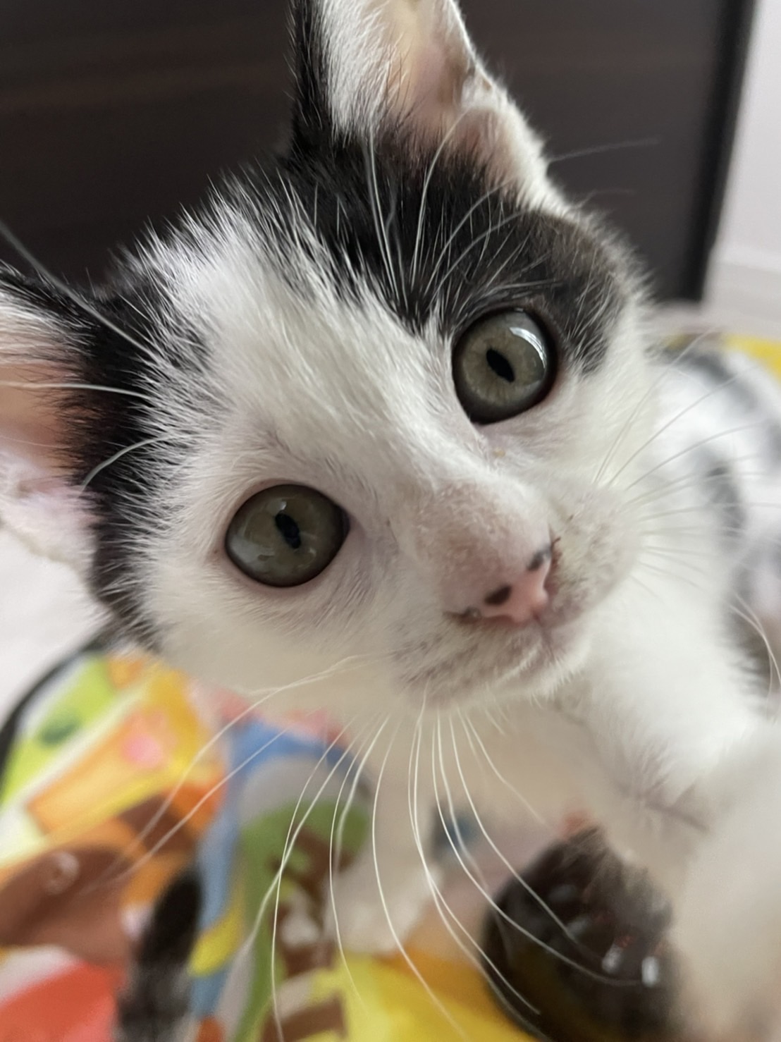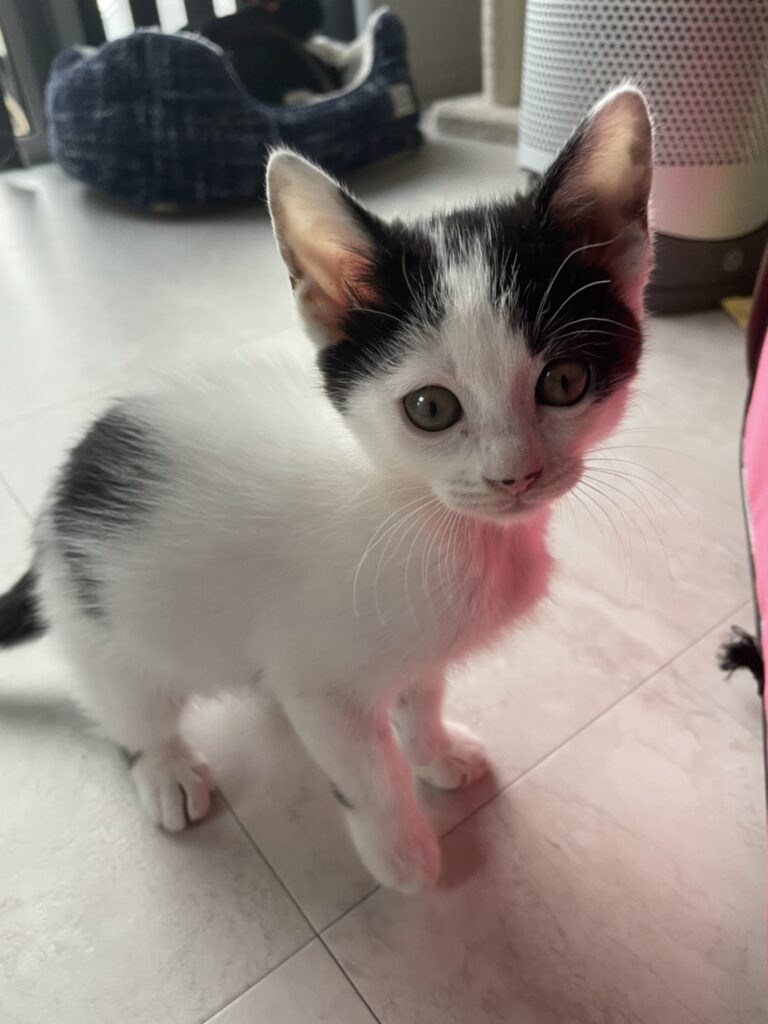 ビミョーなハチワレ具合と、愛嬌のある鼻の柄がチャームポイントです。尻尾は長めです。