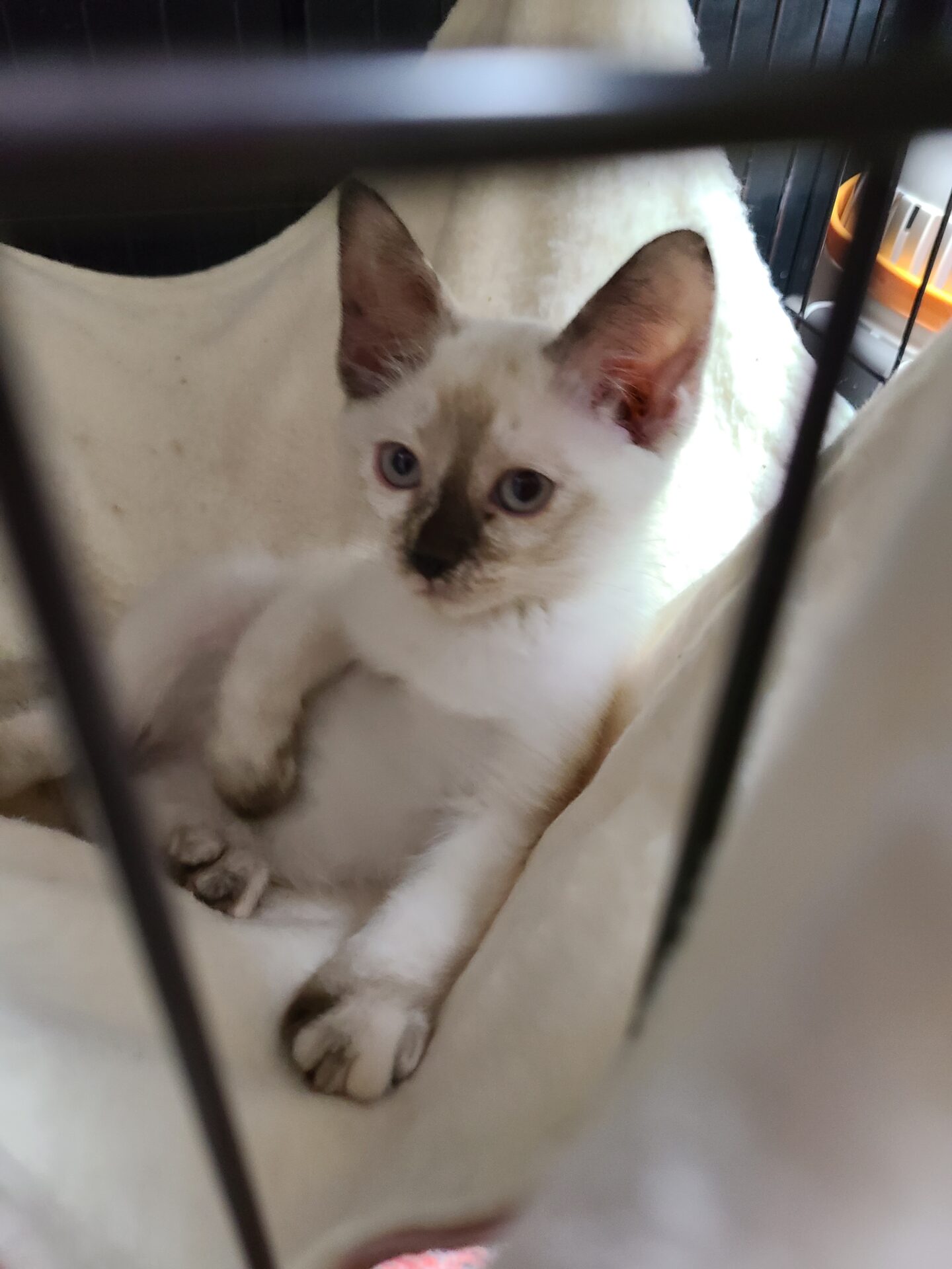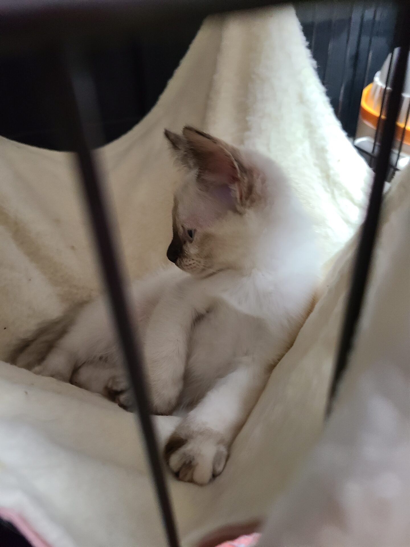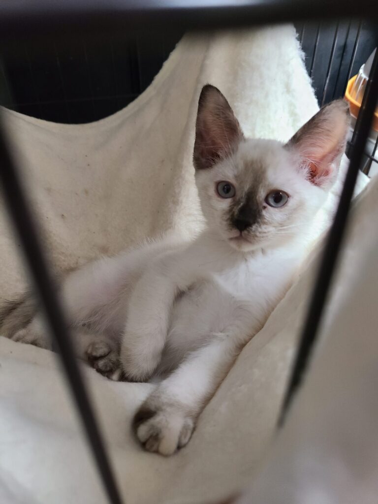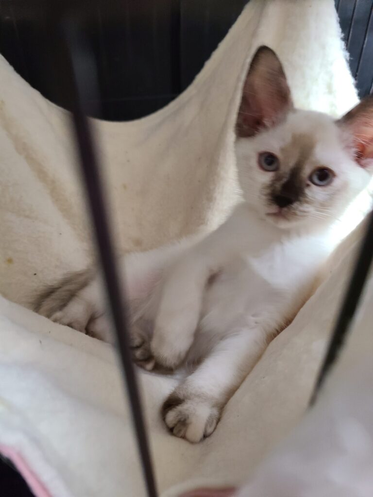 シャム系でお顔の真ん中あたりがこげ茶、手足にもシールポイントがあります。