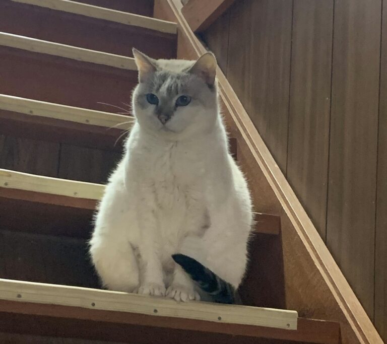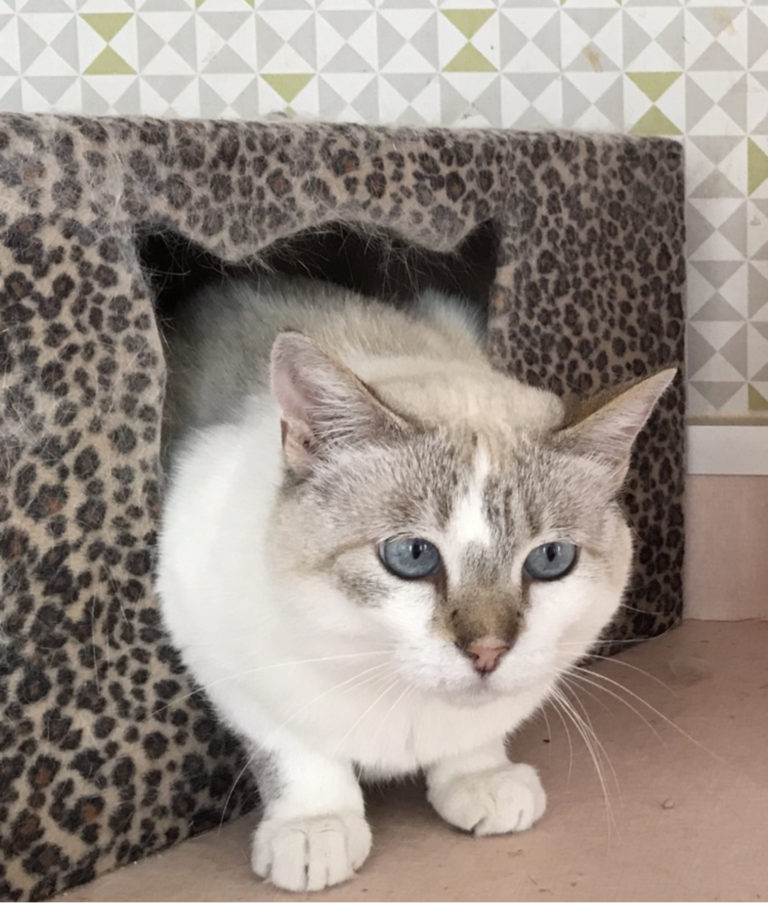 シャム系にブルーの目が美しい猫です。まだおっかなびっくりてますが、時間かけて少しずつ人との距離が縮まるタイプ。他の猫と仲良くできます。
