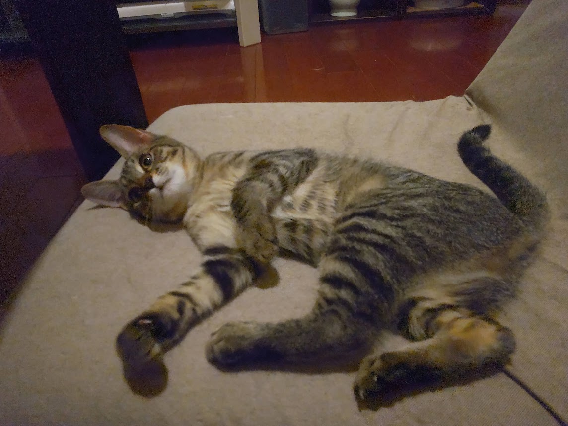 同世代の猫より大人猫の方が好きなようで、小さい声でニャッニャッと鳴いて甘えています。