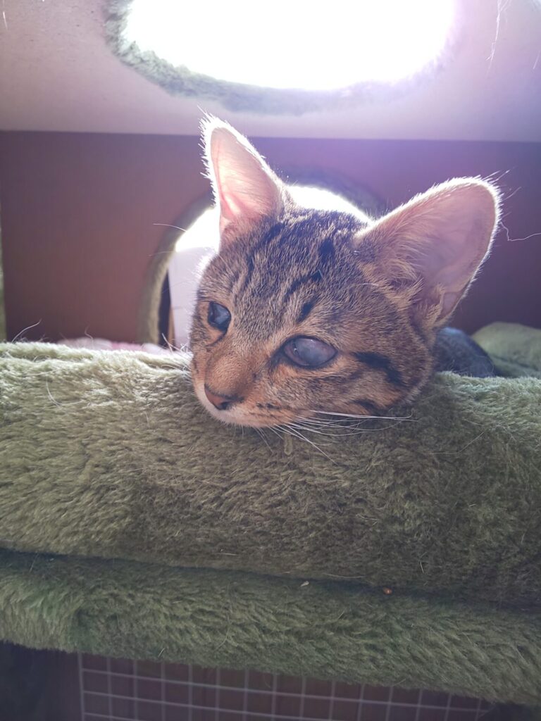 猫とも人とも仲良くできます。光は感じることができますが写真のとおり全盲です。危険物の除去など生活空間の環境整備が必要になります