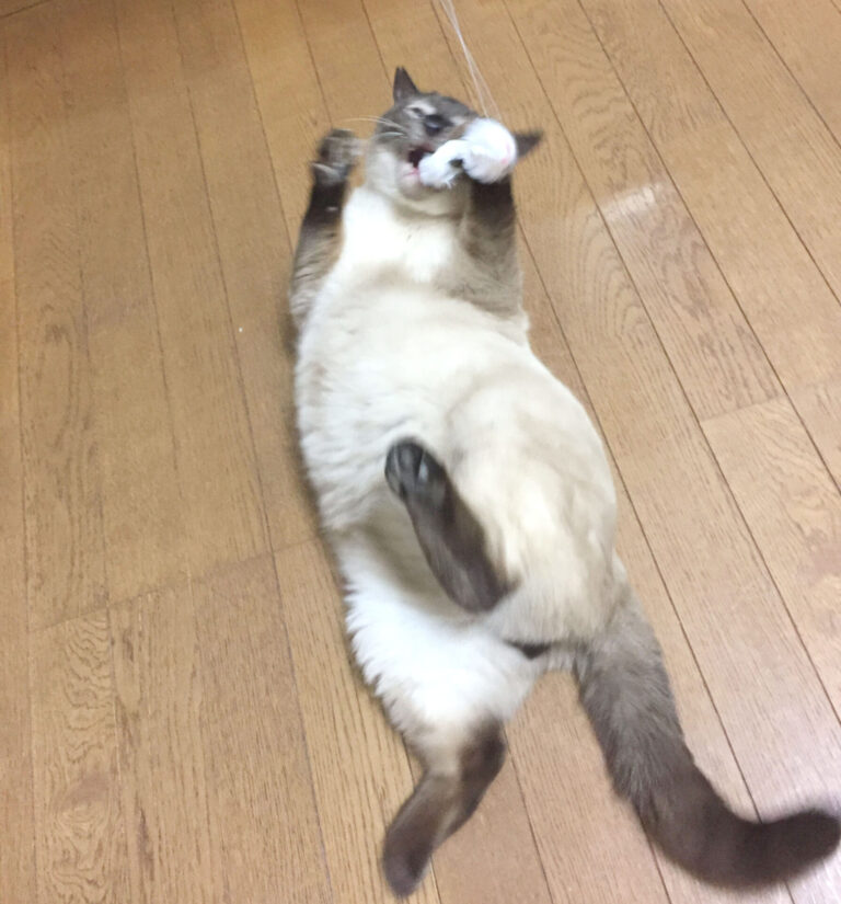名前を呼ぶとお返事し、おもちゃで激しく遊ぶ可愛いおっさん猫です。