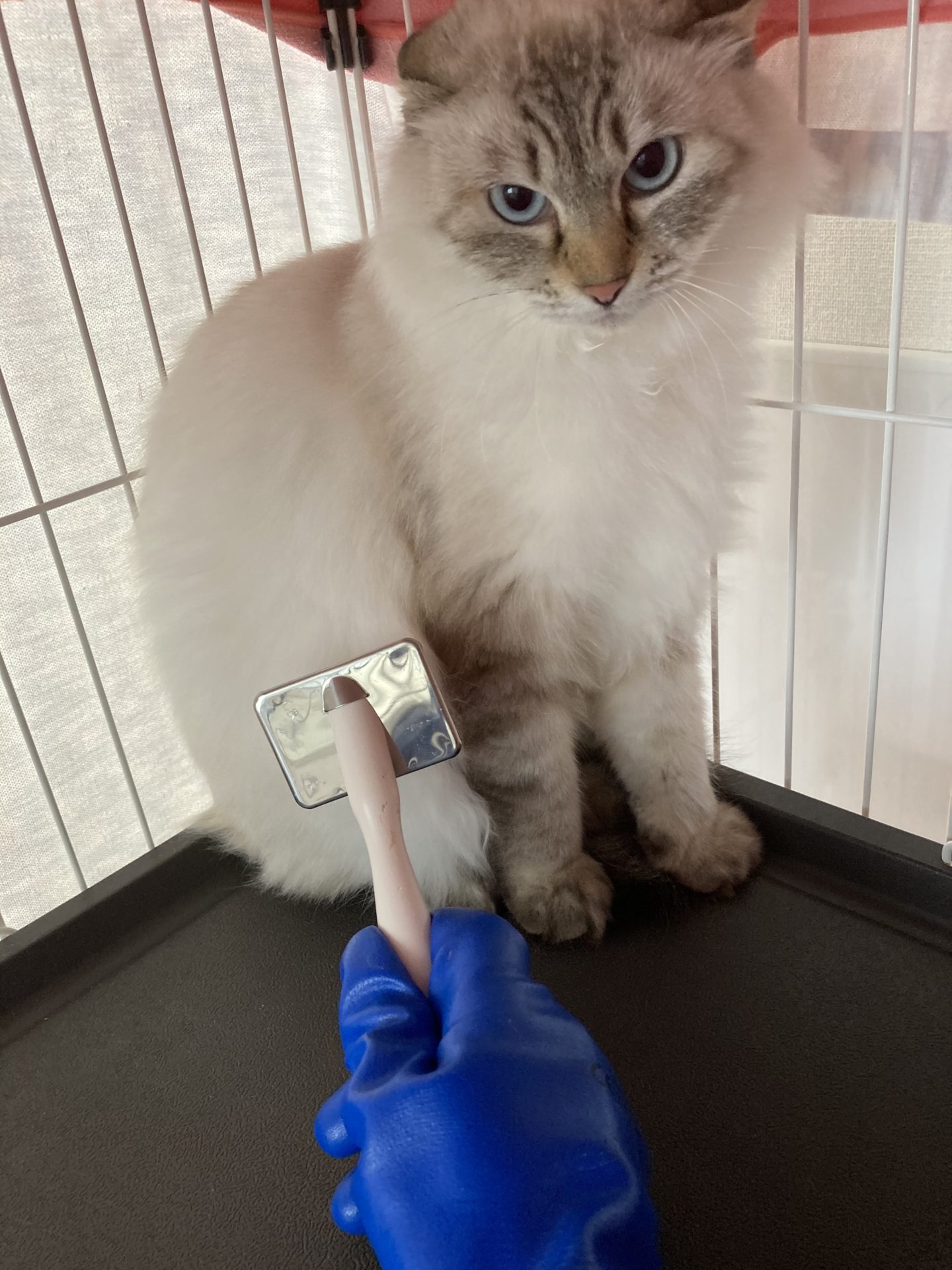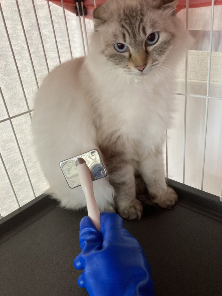 まだ人馴れしていませんが、素手でチュールを食べるようになりました。