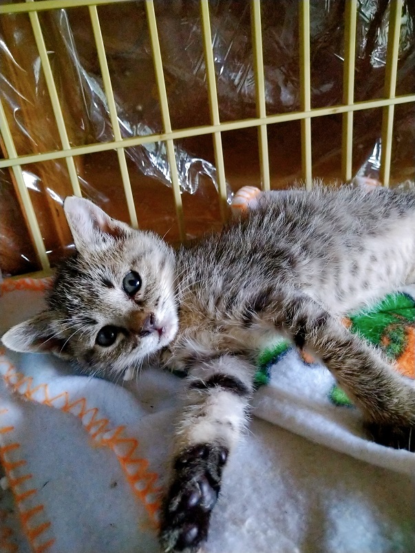 保護当時、栄養不良だったので、まだ毛並みは良くありせんが、ふあふあの毛並みの下に、ベンガルのように、お腹と同じ点々の模様があります。グレーの毛並みの先は、白っぽいです。