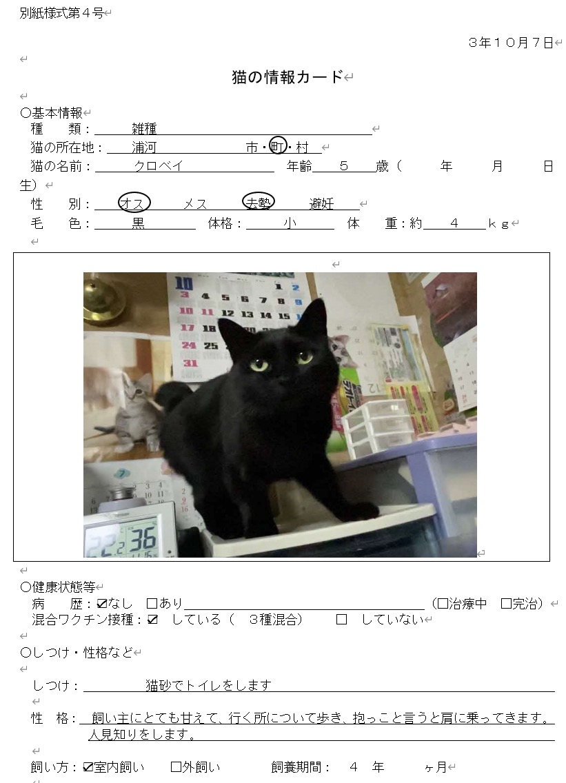 東京の娘さんとの同居が決まりました。これまで「猫がいるから」と頑なに同居を拒んでいましたが、認知症の心配もあり、ご本人の健康とご家族の事を考え里親を探す事になりました。まずは日高振興局の「飼い主探しノート」にて里親探しをしていますが引っ越しを11月に控えニャン友のほうでも募集をすることにいたします。
