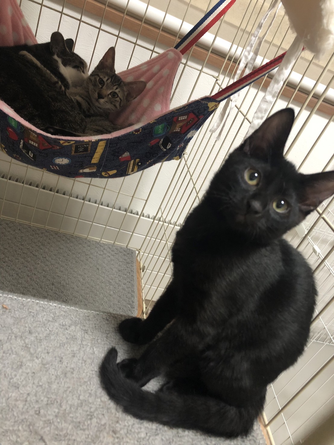 ママの様子を見て人に対してはやや警戒心あります。でもおもちゃをふればすぐ寄ってきます。