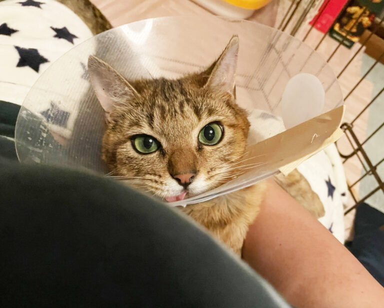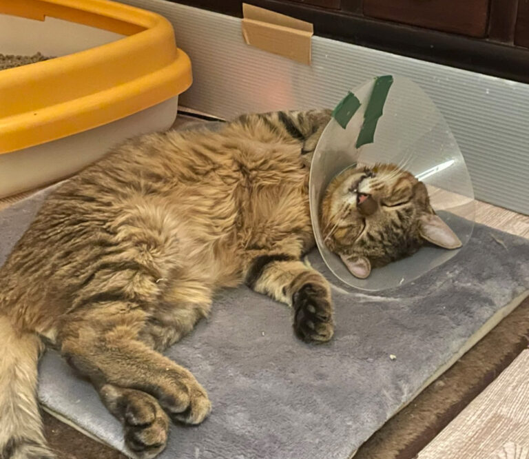 今は代表宅のリビングおりますが、猫は大好きで甘えた声でないて、猫を呼びます。先日カラーがはずれ、初めて抱っこの時にグルグル言えるようになりました。