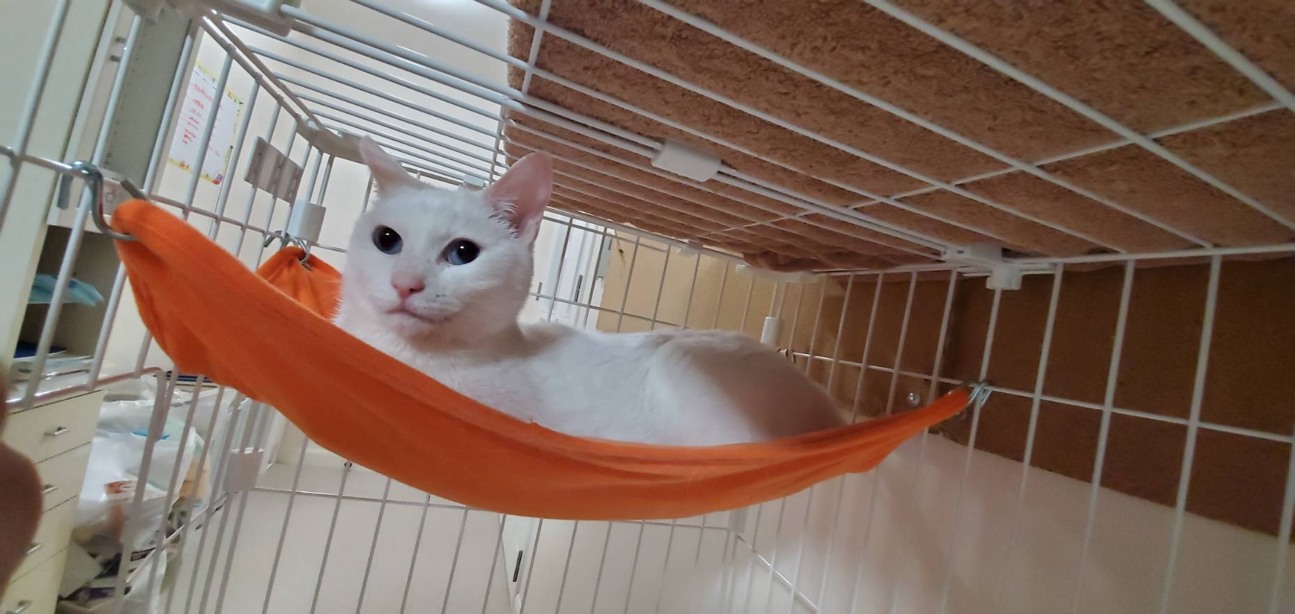 よくハンモックで寝たりします。他のネコちゃんとも仲良く遊びます。