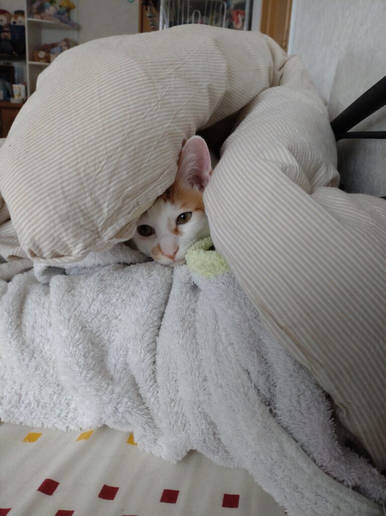夜一緒に寝てますが、布団の中というより顔の近くに居ます。