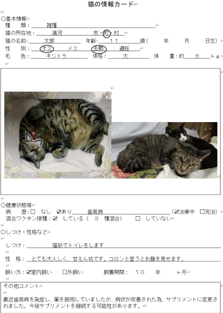 東京の娘さんとの同居が決まりました。これまで「猫がいるから」と頑なに同居を拒んでいましたが、認知症の心配もあり、ご本人の健康とご家族の事を考え里親を探す事になりました。まずは日高振興局の「飼い主探しノート」にて里親探しをしていますが引っ越しを11月に控えニャン友のほうでも募集をすることにいたします。