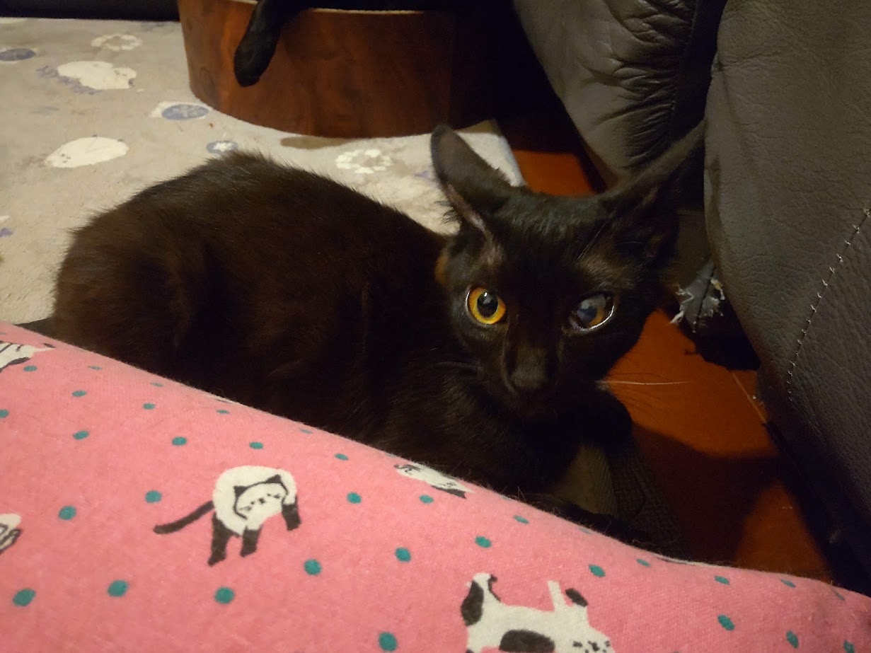 月齢にしてはやや小柄で、毛色はブラックスモークで長めの折れしっぽです。