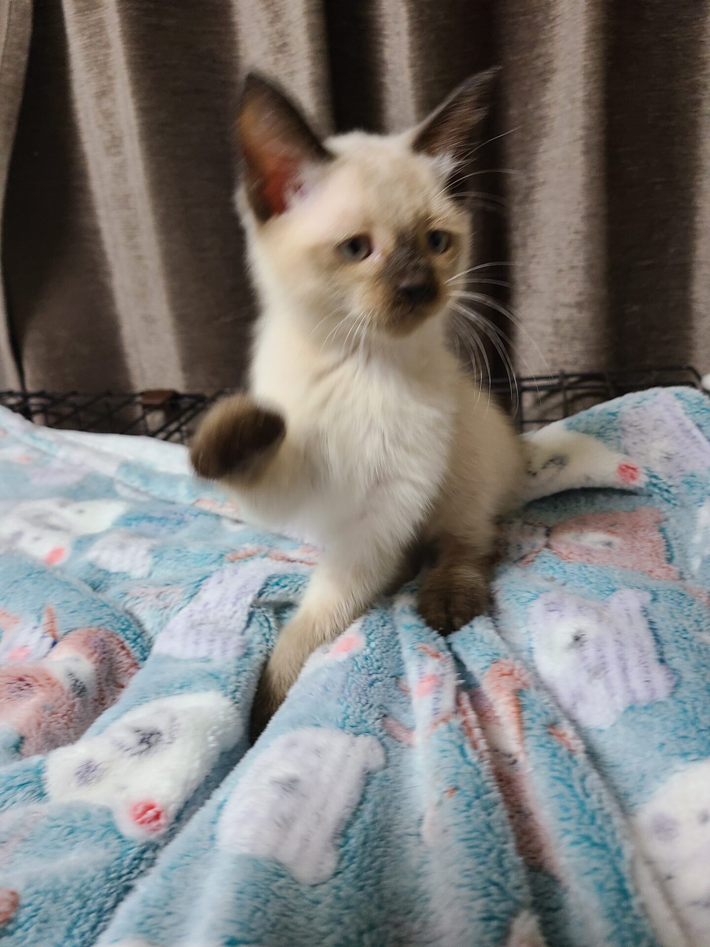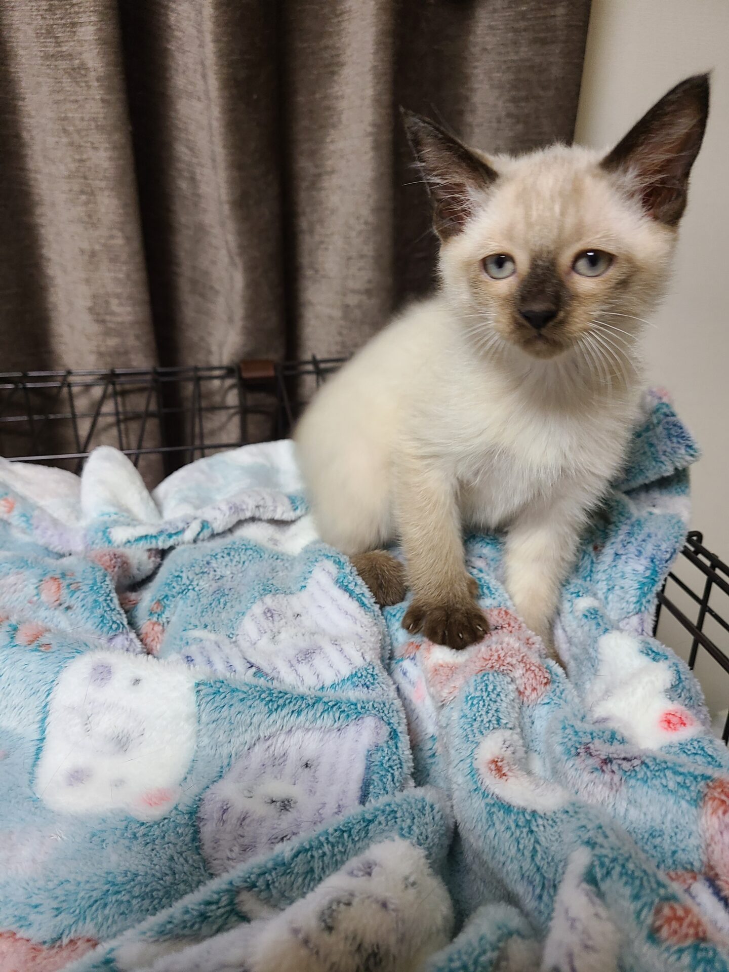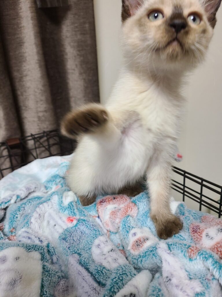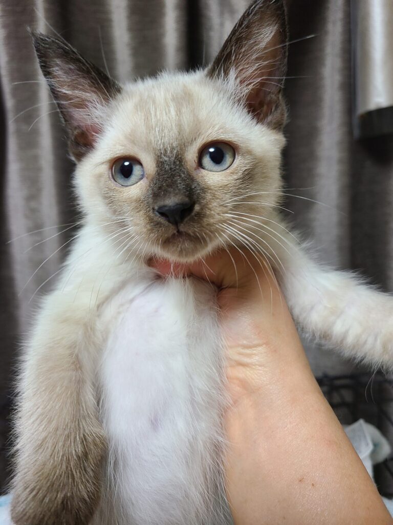 シャム系なので今出ているこげ茶部分のシールポイントやお顔、身体の色はこれから変わって来ると思います。