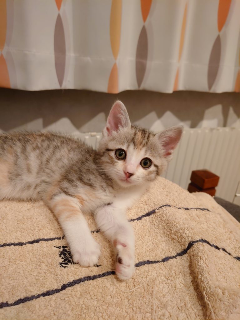 カフェオレの様なパステルミケ模様が可愛い子猫です。